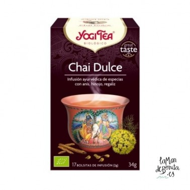 La infusión de Chai Dulce de Yogi Tea se caracteriza por ser una infusión ayurvédica. Con este tipo de infusiones, benefíciate de tener mayor energía día a día, mejorar tu metabolismo, una bebida que te ayuda a limpiar tu organismo y con propiedades antinflamatorias. ¿Qué más puedes pedir?