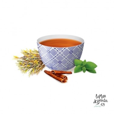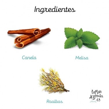 Ingredientes: Melisa, rooibos, regaliz, canela, cáscara de cacao, albahaca, menta piperita, flores de manzanilla, romero, pimienta negra, hinojo, flores de lavanda