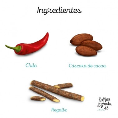 Regaliz**, cáscara de cacao*, hierbabuena*, hinojo*, anís*, jengibre*, menta piperita*, ortiga*, canela*, chile*, cardamomo*, clavo*, pimienta negra*