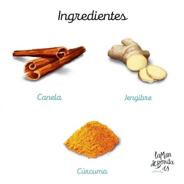 Ingredientes: Cúrcuma (55%), canela (14%), regaliz, jengibre (7%), cardamomo (3%), pimienta negra, manzana, hinojo, macis, cáscara de cacao, clavo