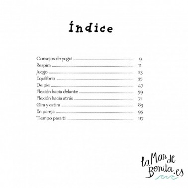 Las actividades se agrupan en 9 tipos de prácticas: Respira: conecta contigo mismo y concéntrate. Juego: juega con tus amigos y deja que brote tu creatividad. Equilibrio: equilíbrate, serénate y alinéate contigo mismo. De pie: adquiere estabilidad, fuerza y enraizamiento con la tierra. Flexión hacia delante: estírate, libera y flexiona. Flexión hacia atrás: flexibilízate, ábrete y confía. Gira y estira: haz torsiones, giros y extensiones. En pareja: disfruta trabajando con un compañero. Tiempo para ti: relájate, descansa y revitalízate.