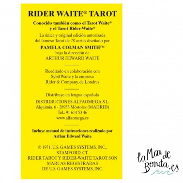 Conocido también como el Tarot Waite® y el Tarot Rider-Waite® La única y original edición autorizada del famoso Tarot de 78 cartas diseñado por Pamela Colman Smith™ bajo la dirección de Arthur Edward Waite Incluye manual de instrucciones realizado por Arthur Edward Waite.