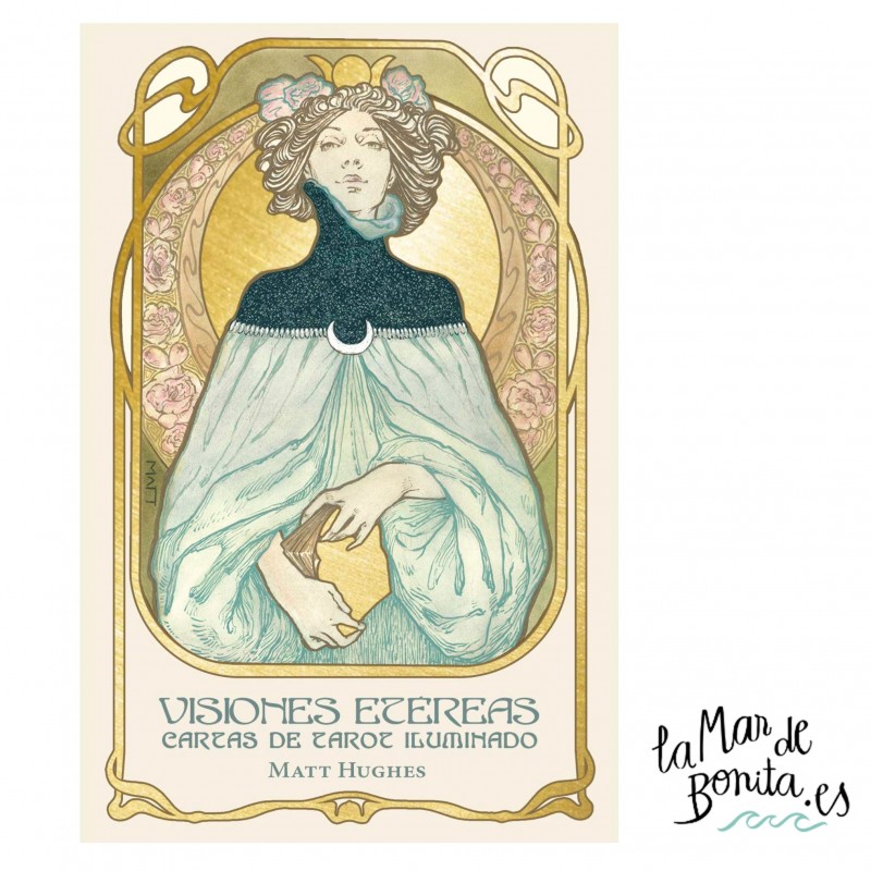 Deseando resaltar el mensaje del manual de las visiones etéreas, Matt hugues se inspira en el movimiento art nouveau. Imagina el tarot de la iluminación, enriquecido con dos nuevas cartas que completan los principales arcanos tradicionales. Su creación ilustra perfectamente su estilo reconocible entre todos y su enfoque meticuloso de la maestría artesana. Las imágenes detalladas que decoran las 80 cartas del paquete están dibujadas y coloreadas a mano. Cada carta está elegantemente iluminada con un estampador de hojas de oro. Caja con libreto de 68 páginas.