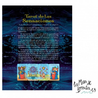 En este tarot, la autora, M.ª del Mar Tort, ha puesto en unas cartas sus 20 años de experiencia enseñando tarot para facilitar su aprendizaje. El Tarot de las Sensaciones está diseñado especialmente para facilitar la interpretación. La base son los 22 arcanos del tarot de Marsella, de los que hemos respetado su simbología y sus colores. Lo que hace diferente este tarot es que no tiene bordes y todos los arcanos tienen un fondo común que nos permite combinar mejor unas cartas con las otras. Los arcanos comparten escenario. Hemos utilizado unos colores que lo hacen muy agradable a la vista y que permiten conectar mejor con la carta. En el paisaje hemos añadido detalles que nos enriquecen. Por ejemplo, las cartas que son estaciones del año tienen una rosa de los vientos, las hojas del suelo nos marcan el movimiento y la evolución de las circunstancias, las cartas kármicas tienen una pequeña nube, las cartas que representan a personas en concreto tienen un anillo, etc. Todo ello para ayudar a las personas a mejorar sus interpretaciones.