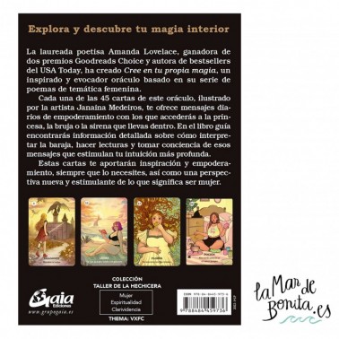 Cada una de las 45 cartas de este oráculo, ilustrado por la artista Janaina Medeiros, te ofrece mensajes diarios de empoderamiento con los que accederás a la princesa, la bruja o la sirena que llevas dentro. En el libro guía encontrarás información detallada sobre cómo interpretar la baraja, hacer lecturas y tomar conciencia de esos mensajes que estimulan tu intuición más profunda.