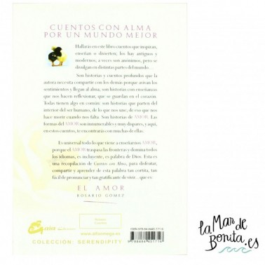 Hallarás en esta obra cuentos que inspiran, enseñan o divierten: los hay antiguos y modernos: a veces son anónimos, pero se divulgan en distintas partes del mundo... Son historias y cuentos profundos que la autora necesita compartir con los demás porque avivan los sentimientos y llegan al alma: son historias con enseñanzas que nos hacen reflexionar, que se guardan en el corazón. Todas tienen algo en común: son historias que parten del interior del ser humano, de lo que nos une: de eso que nos hace morir cuando nos falta. Son historias de AMOR. Las formas del AMOR son innumerables y muy dispares y, aquí, en estos cuentos, te encontrarás con muchas de ellas. "Es universal todo lo que viene a enseñarnos AMOR, porque el AMOR traspasa las fronteras y domina todos los idiomas, es incluyente, es palabra de Dios. Ésta es una recopilación de CUENTOS CON ALMA, para disfrutar, compartir y aprender de esta palabra tan cortita, tan fácil de pronunciar y tan gratificante de vivir... que es: EL AMOR La autora Los cuentos suelen enseñarnos, de una manera sencilla y sutil, verdades muy profundas del comportamiento humano, y en ellos podemos hallar mensajes reveladores para la evolución de nuestros sentimientos y de nuestro ser. La intención de este libro es llegar al corazón de todas las personas. Sin exclusiones. Por eso se pueden encontrar historias y cuentos universales, para que todas las religiones, todas las culturas, todas las razas y todas las otras "diferencias" que nos separan se encuentren aquí de algún modo representadas. Son cuentos cortos, aunque sus huellas nos encaminan a lo que en verdad somos: seres espirituales con una existencia humana. ROSARIO GÓMEZ nació en Chile, en 1958, y se halla comprometida con el despertar de lo más profundo en cada uno de nosotros. Ha publicado cuatro volúmenes de CUENTOS CON ALMA que, por su gran acogida, cuenta ya con numerosas ediciones. Son hsitorias plenas de amor, que nos llevan a reflexionar acerca de la vida y de nuestra existencia. Este primer volúmen que presentamos en Gaia Ediciones contempla los volúmenes I y II de sus ediciones originales.