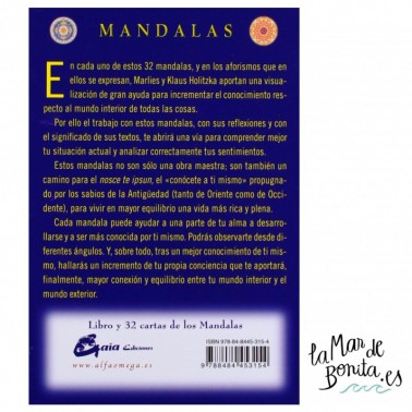 En cada uno de estos 32 mandalas, y en los aforismos que en ellos se expresan, Marlies y Klaus Holitzka aportan una visualización de gran ayuda para incrementar el conocimiento respecto al mundo interior de todas las cosas. Por ello el trabajo con estos mandalas, con sus reflexiones y con el significado de sus textos, te abrirá una vía para comprender mejor tu situación actual y analizar correctamente tus sentimientos. Estos mandalas no son sólo una obra maestra: son también un camino para el nosce te ipsun, el ?conócete a ti mismo? propugnado por los sabios de la Antigüedad (tanto de Oriente como de Occidente), para vivir en mayor equilibrio una vida más rica y plena. Cada mandala puede ayudar a una parte de tu alma a desarrollarse y a ser más conocida por ti mismo. Podrás observarte desde diferentes ángulos. Y, sobre todo, tras un mejor conocimiento de ti mismo, hallarás un incremento de tu propia conciencia que te aportará, finalmente, mayor conexión y equilibrio entre tu mundo interior y el mundo exterior.
