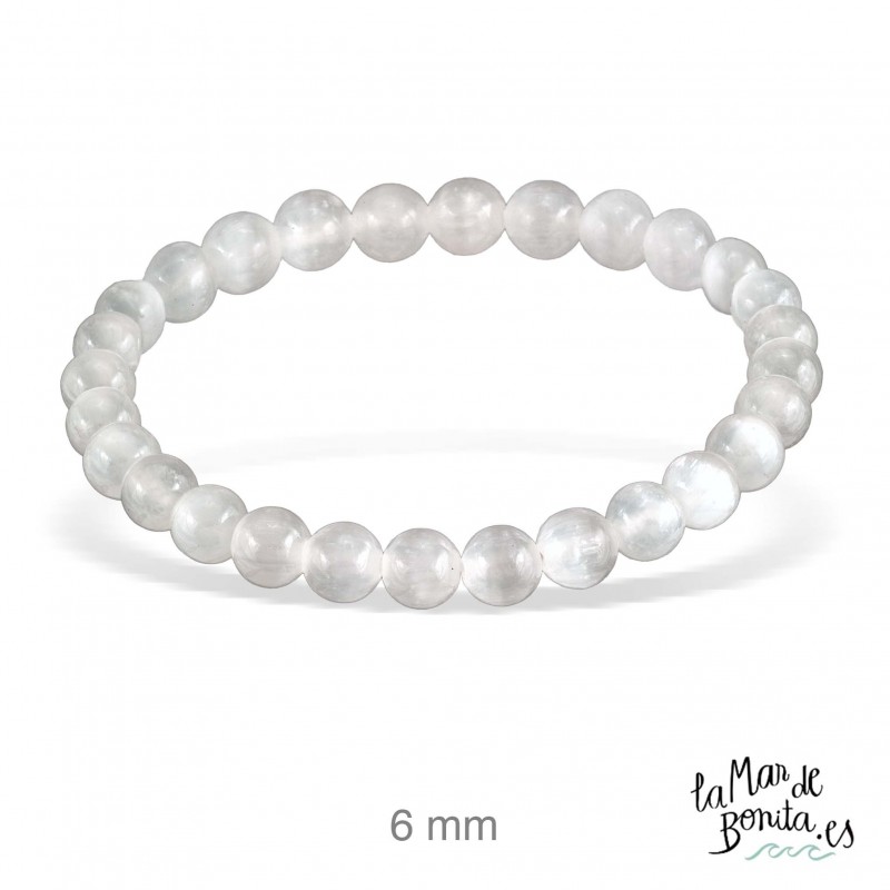 En La Mar de Bonita, hemos preparado esta pulsera de Selenita natural pensando en ti. Es una pieza delicada y súper especial, ideal para regalar o darte un capricho. Te la entregamos en nuestra caja color aguamarina de 8x8 cm con el logo de la marca, ¡perfecta para reutilizarla como joyero! La talla es única, con un diámetro de 16 a 18 cm, para que se adapte cómodamente a la mayoría de muñecas y puedas llevar contigo una pulsera natural, purificadora y llena de esa energía de luz y paz celestial.