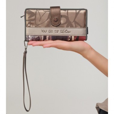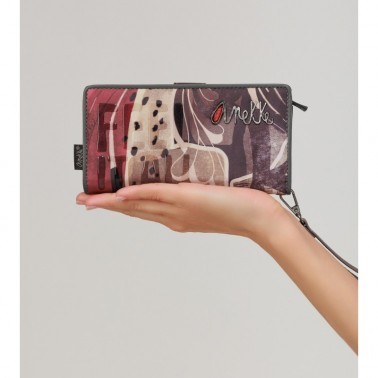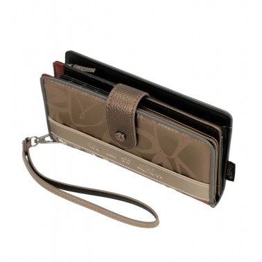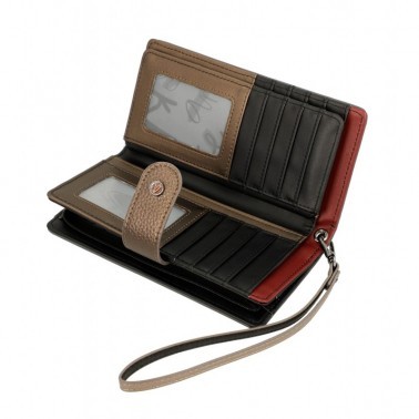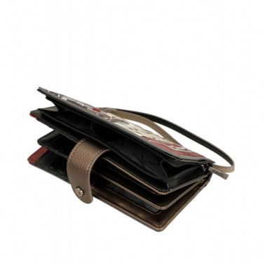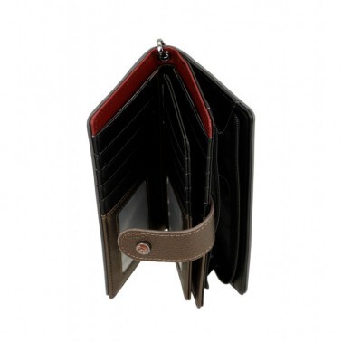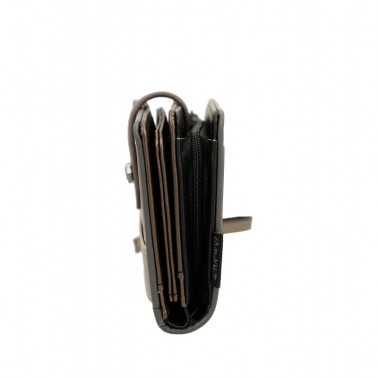 Este billetero de tamaño grande cuenta con dos compartimentos principales: la parte trasera, donde encontrarás un amplio billetero y espacio para billetes, tarjetas o documentos, y la parte superior con cierre de cremallera, en cuyo interior podrás guardar monedas. Todo el interior va forrado. Además, cuenta con un asa de mano para transportar mucho más cómodo.