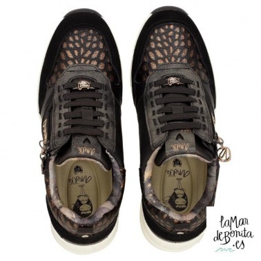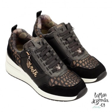 Estos sneakers con cuña exterior no sólo estilizan, si no que son tan cómodos que no querrás quitártelos. Su base en color negro contrasta con la suela blanca, así como con su diseño repleto de detalles en contraste metálico brillante en tono oro rosa. Son unos deportivos con cordones y cientos de detalles decorativos, pero a la hora de ponerlos cuentan con una cremallera lateral que facilita su cierre. La suela hace que cada pisada sea cómoda, convirtiéndolos en el calzado perfecto para el día a día.