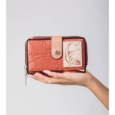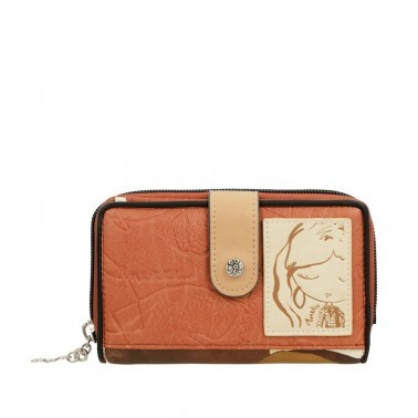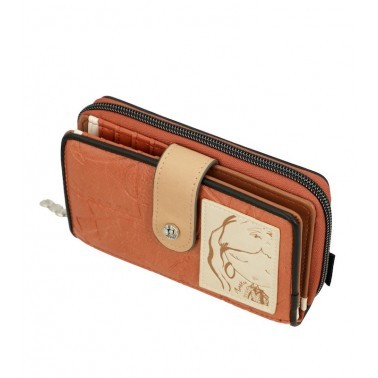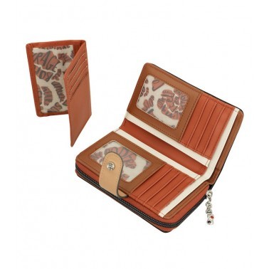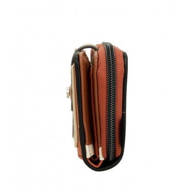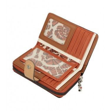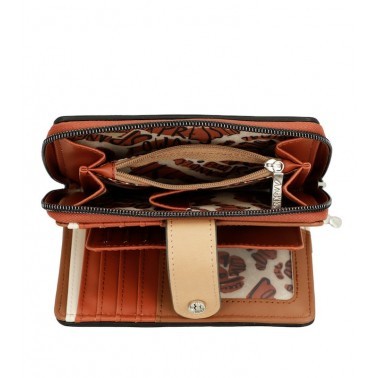 Este billetero mediano cuenta con dos compartimentos: el trasero, con cierre de lengüeta, que cuenta con múltiples espacios para tarjetas y billetes: y el superior, con cierre de cremallera, que cuenta en su interior con espacio para monedas. Todo el interior está forrado.