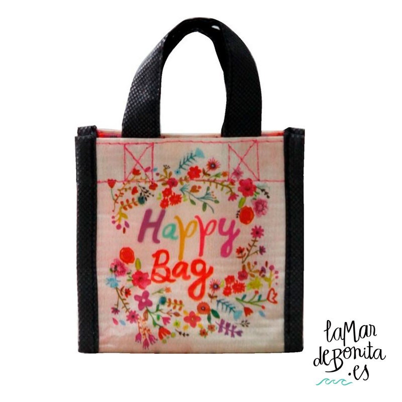 Fondo beige con estampado floral en diferentes tonos con texto en contraste “HAPPY BAG” (bolsa feliz).