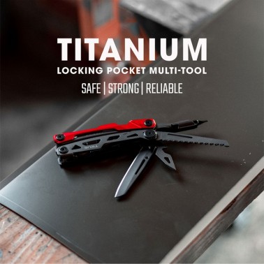 Juego de herramientas de titanio todo en uno con bloqueo. Esta multiherramienta de bolsillo de titanio es un juego de herramientas todo en uno de alta resistencia que alberga una hoja de pata de oveja de 70 mm de filo fino y un par de alicates y cortaalambres con resorte.