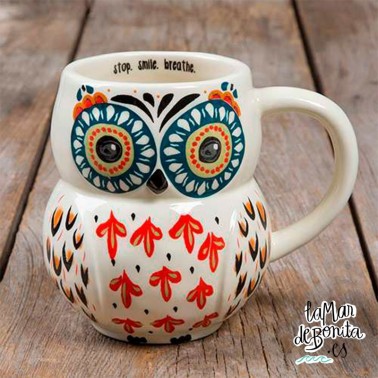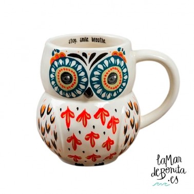 Si tienes los ojos bien abiertos, verás que esta taza en forma de búho es para ti. Con fondo blanco, y colores muy vivos sobre este fondo, podrás ver un bonito búho en esta taza, que además, te invita a reflexionar haciendo un parón en tu día a día, a sonreír y a respirar. Es perfecta para tus momentos de relajación y de diálogo contigo misma, para ver cómo ha ido el día si tomas tu bebida preferida al final de éste, o cómo te lo planteas si la estás disfrutando por la mañana a primera hora.