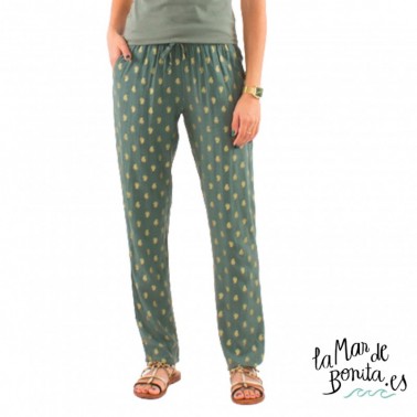 Para las mujeres que se quieran subir al tren de la comodidad y frescura, que sepáis que en nuestra web y tiendas físicas, hemos incluido esta nueva colección confeccionadas en cashmere que deletrean felicidad y tendencia. Este pantalón en color caqui y un estampado dorado, quedará estupendo con una camiseta de tirantes en un tono parecido, así como unas frescas sandalias para que tus pies se vean liberados del sofocante calor en verano.
