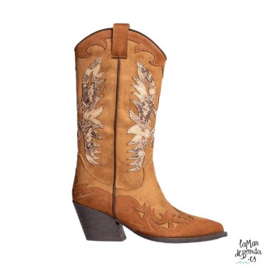 Esta Bota estilo cowboy es de caña alta., 32 cm exactamente. Cuenta con tiradores en los laterales para que colocartela sea muy sencillo. Acabado en punta, al más puro estilo del farwest. Tiene una cremallera en el lateral en la parte interior, para no romper el precioso diseño en color camel y detalles cosidos en serpiente. La altura del taco te dará 6 cm extras a la gran mujer que ya eres, y son maravillosasmente comodas, las uses para donde y cuando quieras.
