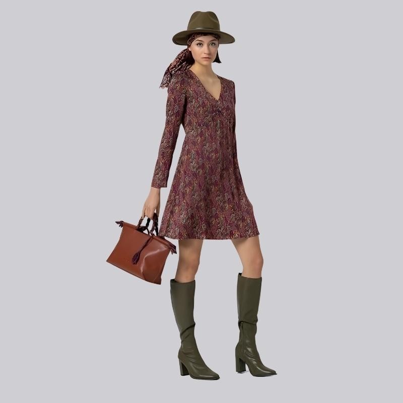 Este vestido corto de viscosa fluida destaca por su estampado paisley, escote en pico, manga larga y corte evasé, que se adapta cómodamente al cuerpo. Ligero y fácil de llevar, es una prenda original y versátil, perfecta para combinar con botas o botines.