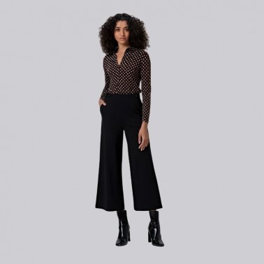 Este pantalón amplio destaca por su cintura con botones decorativos, que aporta un toque elegante y contemporáneo. Confeccionado en un tejido fluido y confortable, su corte amplio ofrece comodidad y libertad de movimiento, ideal para looks relajados o más sofisticados.