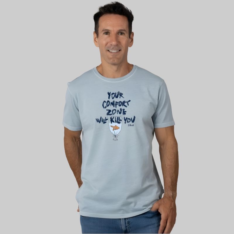 Camiseta de manga corta, fabricada en España, en algodón 100% suave y ligero. Natural y fresca. Diseño de bolsa de plastico con un pez dentro, con la enseñaza de que la zona de confort puede matarte, osea que hay que mover ese culo y salir a buscar la oportunidad. Bonita frase, y enseñanza necesaria para nunca acomodarse.