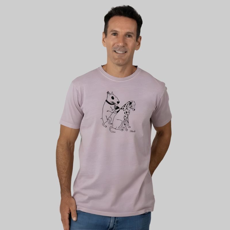 Camiseta de manga corta, fabricada en España, en algodón 100% suave y ligero. Natural y fresca. Un diseño color purple con una divertida ilustración frontal ¨tattoo¨de un perro tatuando a otro las pecas del dalmata. ¡Es graciosisima!