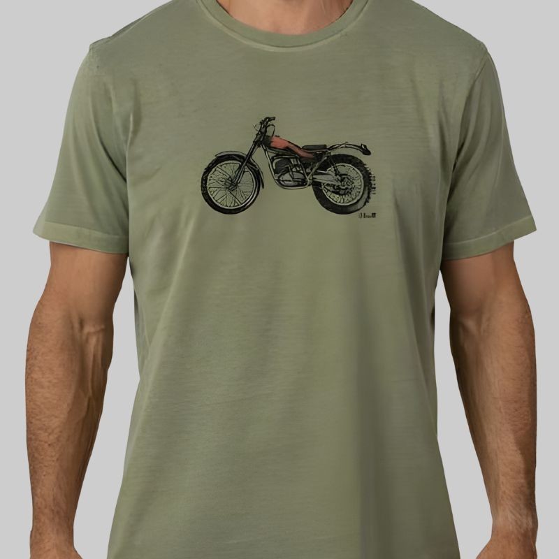 Camiseta de manga corta, fabricada en España, en algodón 100% suave y ligero. Natural y fresca. Un diseño colorverde safaricon print frontal de inspiración motera. Cuello redondo, manga corta, cómoda y tintado en prenda, diseñada para durar.